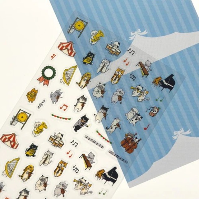 シートシール CAT ORCHESTRA 手帳やノートなどにデコレーションしやすい小さいサイズの透明素材のシールです 同じイラストが2柄ずつ入っているので、保存用にしたりお揃いやシェア使いも楽しめます 枚数:1枚 サイズ:縦180×横95 材質:透明PET 製造地:日本 シンジカトウ カトウシンジ シール 猫