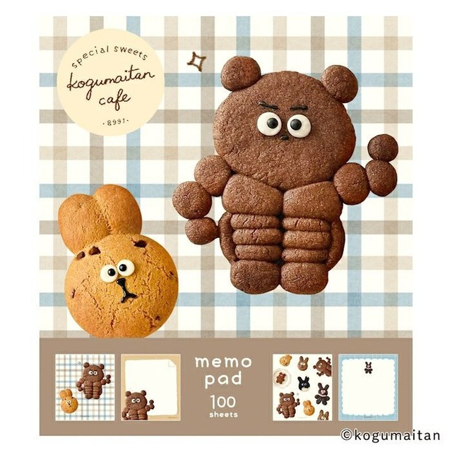 メモパッド クマッスル お顔のついた個性的なお菓子が話題の『こぐまいたんカフェ』が古川紙工とコラボ! とにかくたくさんのお菓子たちが詰め込まれたデザインのメモパッドです 内容:100枚綴り(4柄アソート) サイズ:H90×W80mm 材質:洋紙 生産地:日本 こぐまいたん クッキー 古川紙工 メモ帳