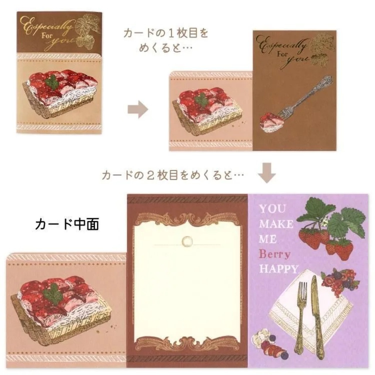 手前のフラップをめくるとタルトやショートケーキが食べられているなど