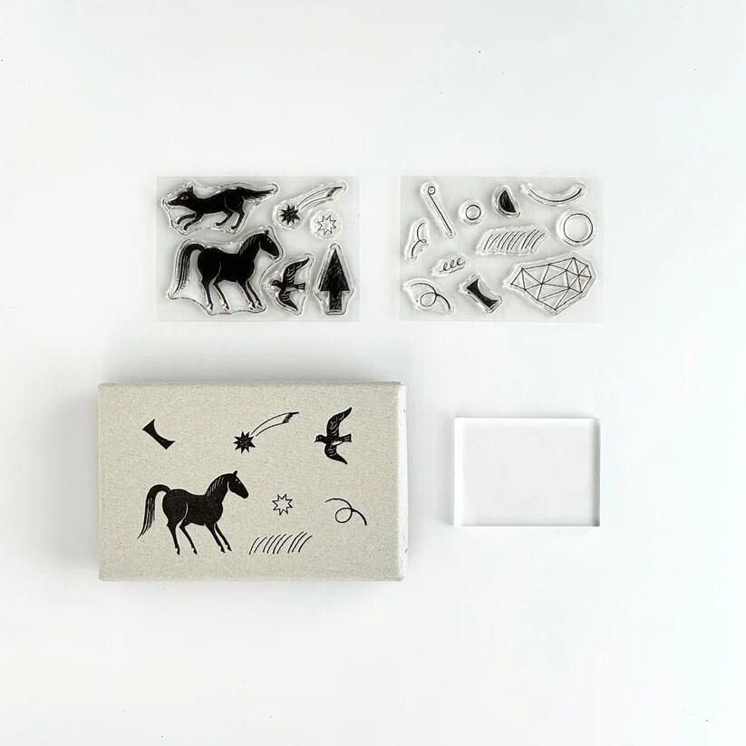 馬や鳥といった幻想的な雰囲気を纏った動物たちと、幾何学的なモチーフをたっぷり詰め込んだセットは、動物と幾何学模様を組み合わせたり、動物単体で押したり、幾何学柄だけでモダンなパターンを作ってみるのもおすすめです