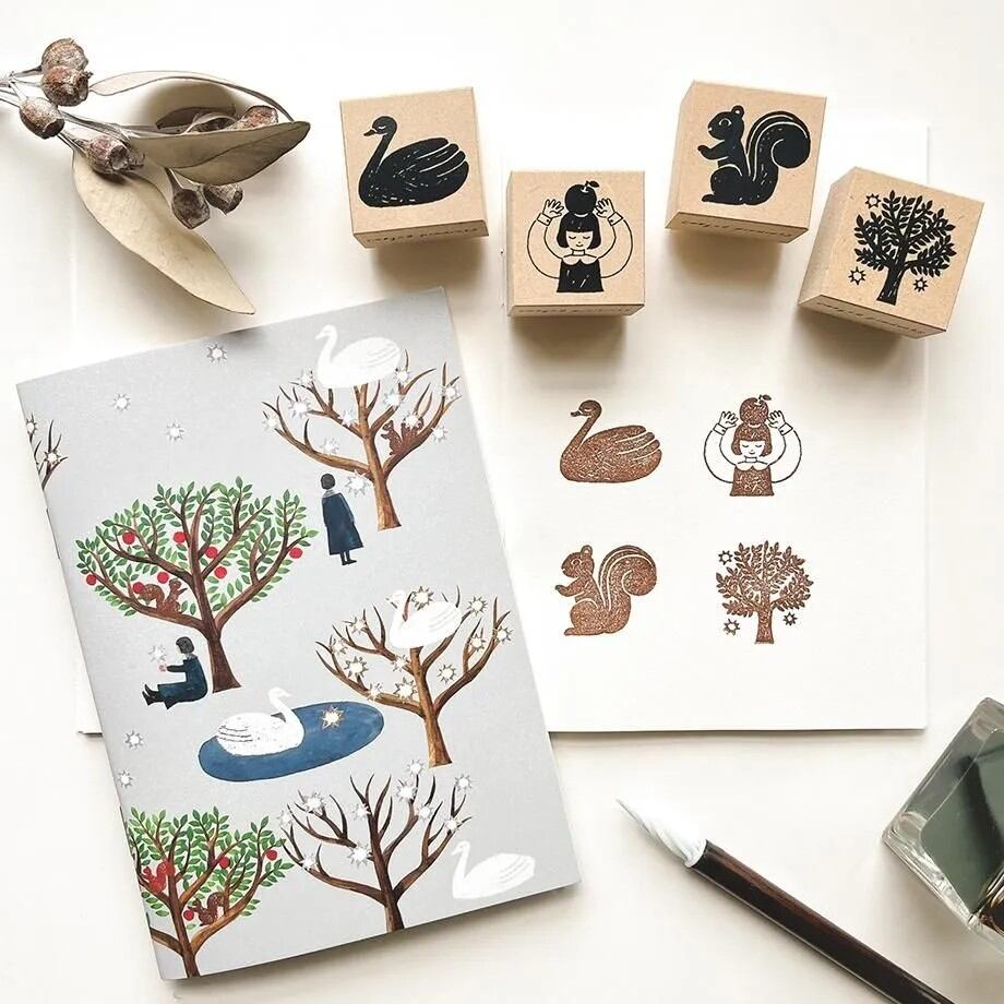 白鳥のすむ美しい森が描かれた、西淑のおしゃれなスタンプノート