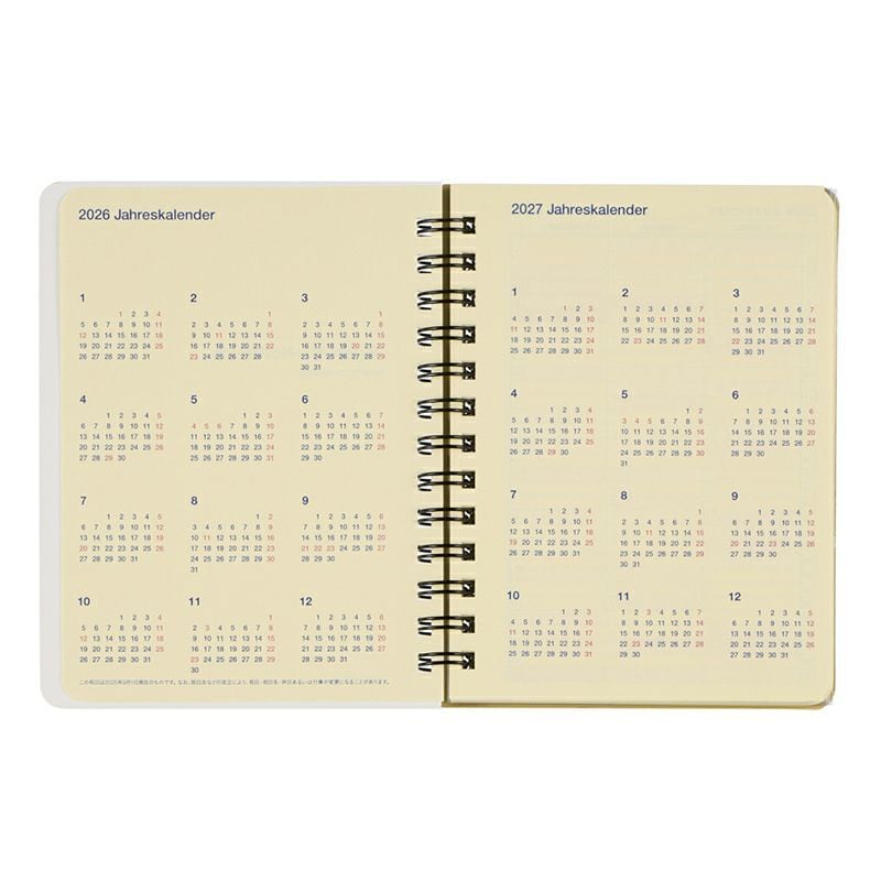 表紙を開くと、中扉、イヤーカレンダー、イヤースケジュール、マンスリー、方眼メモページ、クリアポケットが続きます