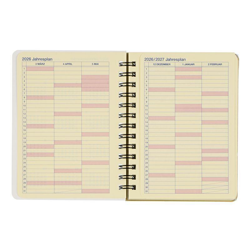 表紙を開くと、中扉、イヤーカレンダー、イヤースケジュール、マンスリー、方眼メモページ、クリアポケットが続きます