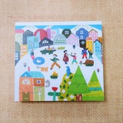 いろんな人やどうぶつたちが楽しそうに暮らす街の景色が描かれているメモ