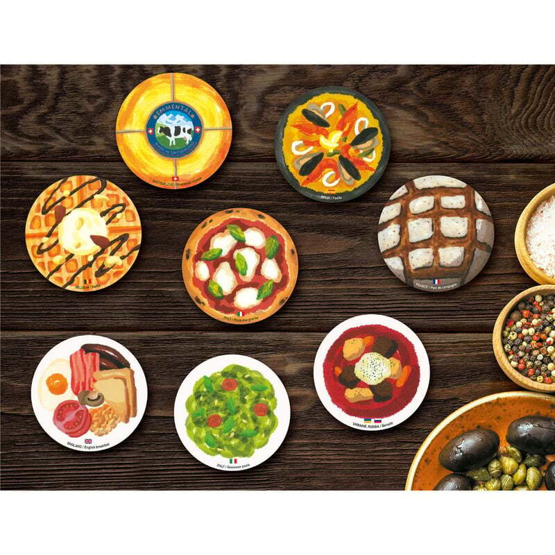 世界の料理や食材をモチーフにした丸型のメモ帳が机の上を楽しく彩ります