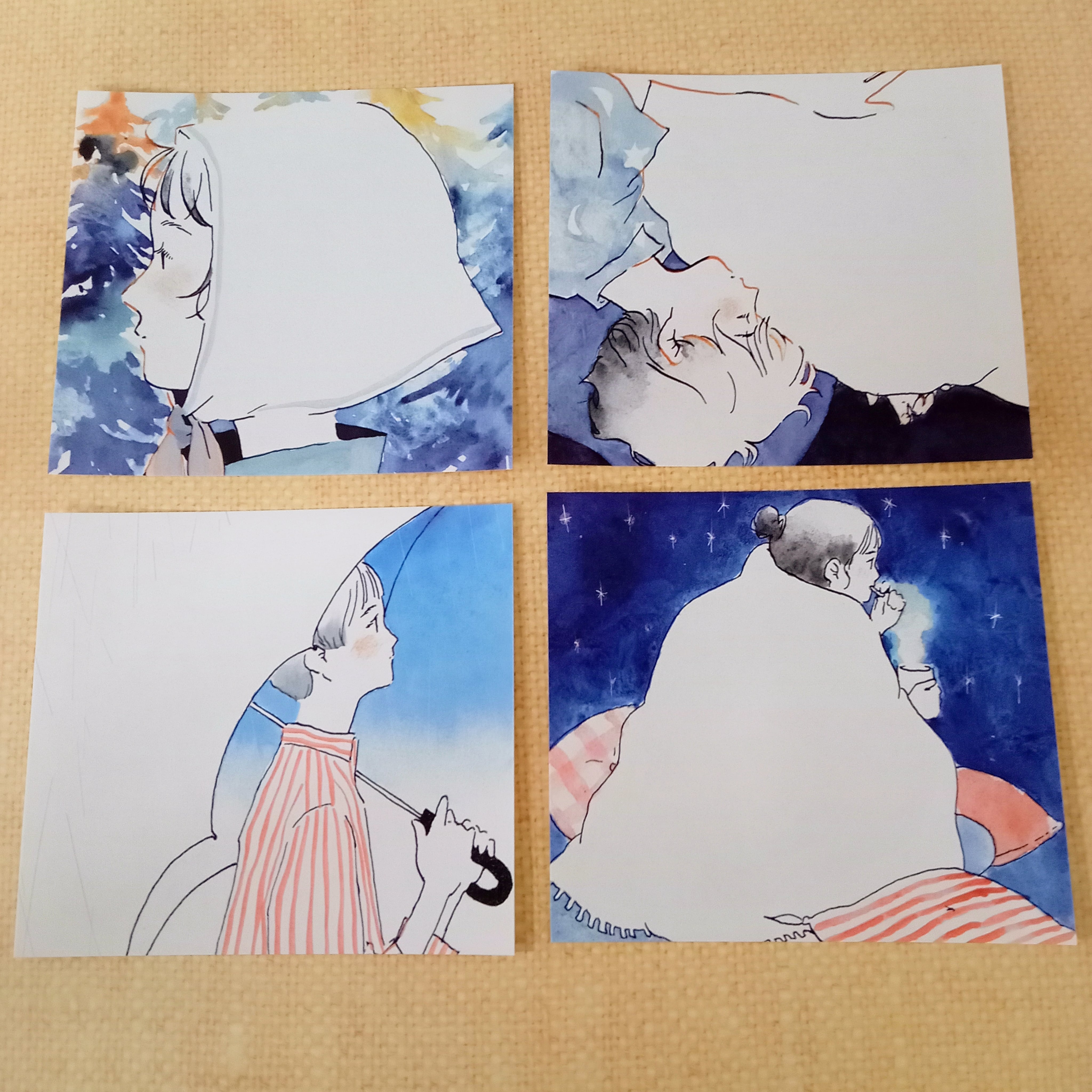 じわっとにじむ青色や赤色を使って、暮らしの中のいろんなシーンが描かれています