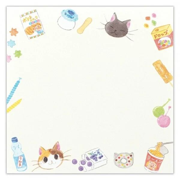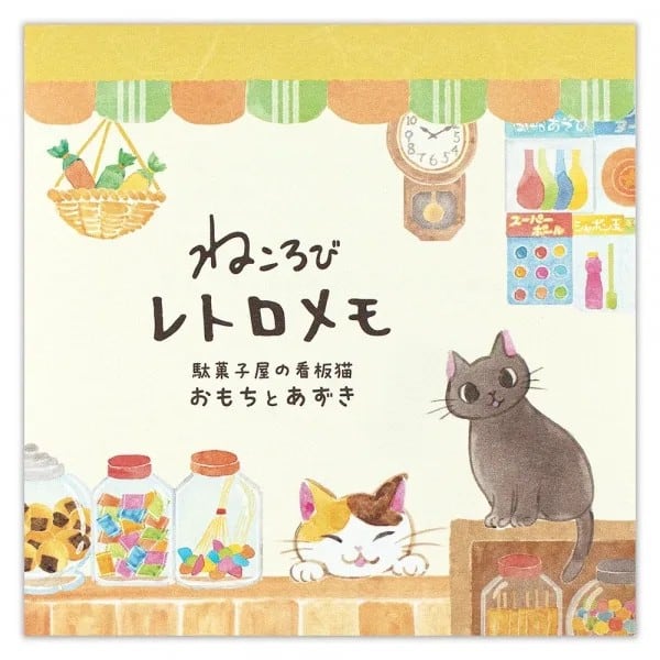 昔懐かしい駄菓子屋看板猫のおもちとあずきと、お菓子やレトロなおもちゃを描いたメモです